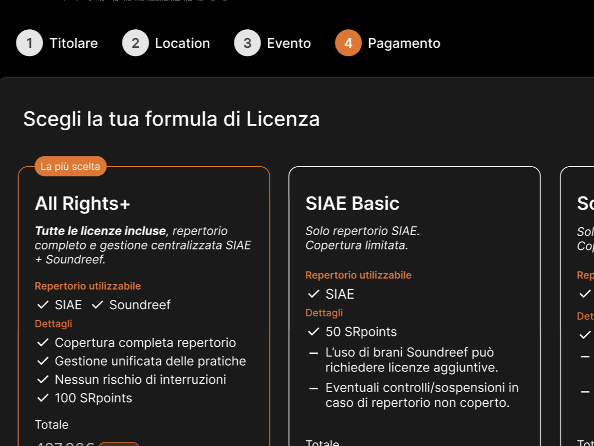 Riduce gli errori e rende l’esperienza più intuitiva. Sulla base della tipologia di evento che hai inserito, ci occupiamo noi di richiedere la licenza alle collecting giuste.